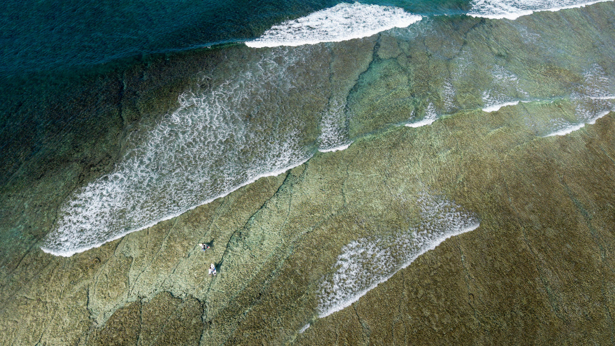 Top-down Aerial surf photography capturing surfers moving across a shallow reef between breaking waves and exposed textures.