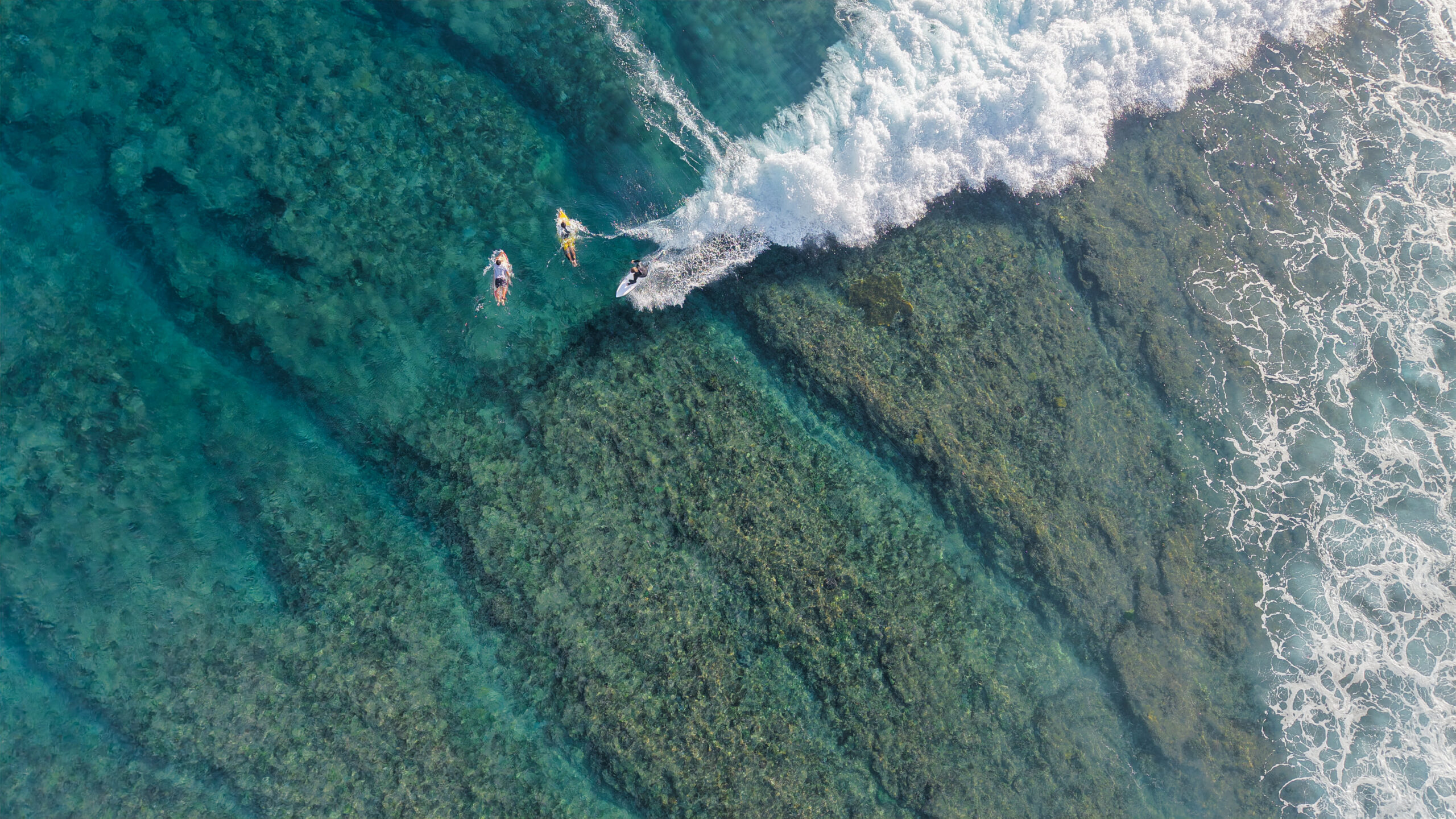 Top-down aerial surf photography capturing surfers paddling over a shallow reef as a clean wave rolls through textured turquoise water.