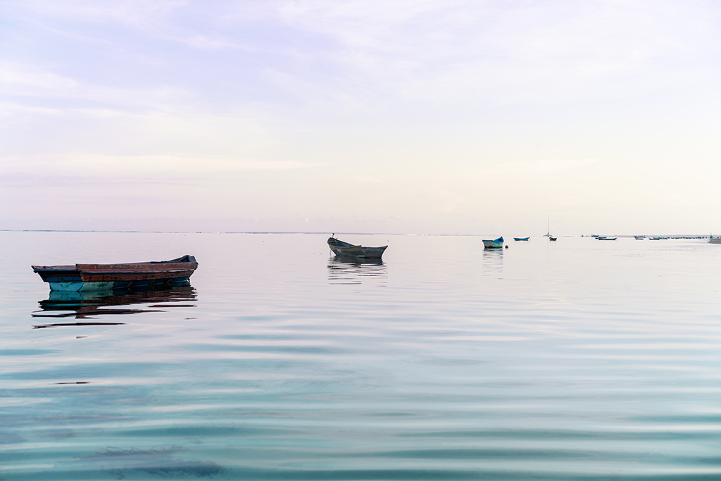 Minimal seascape photograph of small wooden boats drifting on calm water beneath a soft pastel sky.